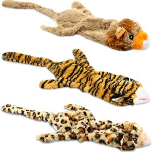 Stuffing Free Dog Toys, No Stuffing Dog Chew Toys Set with Lion Tiger and Leopard Squeaky Plush Dog Toys for Small Medium Large Dogs – 3 Packs