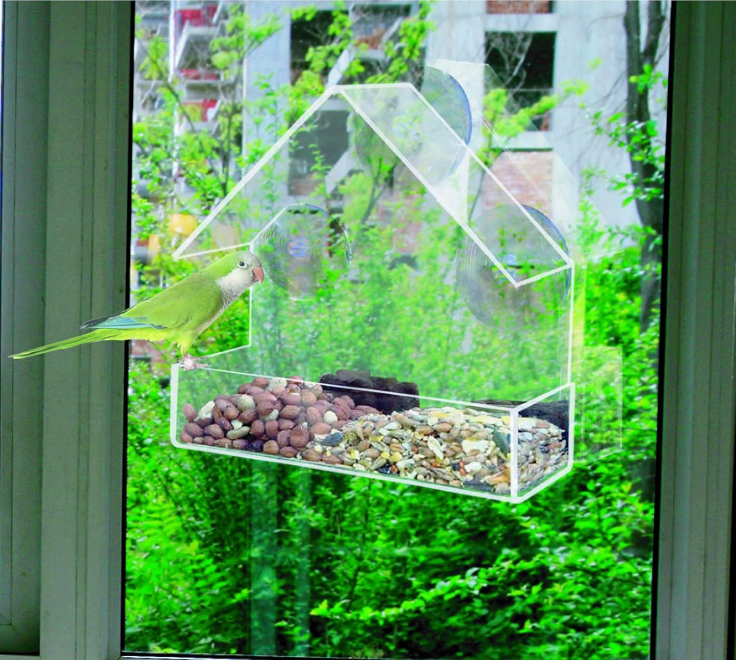 This quick & easy to install transparent acrylic feeder comes with a feed tray & 3 suction cups on the back to secure onto window glass.