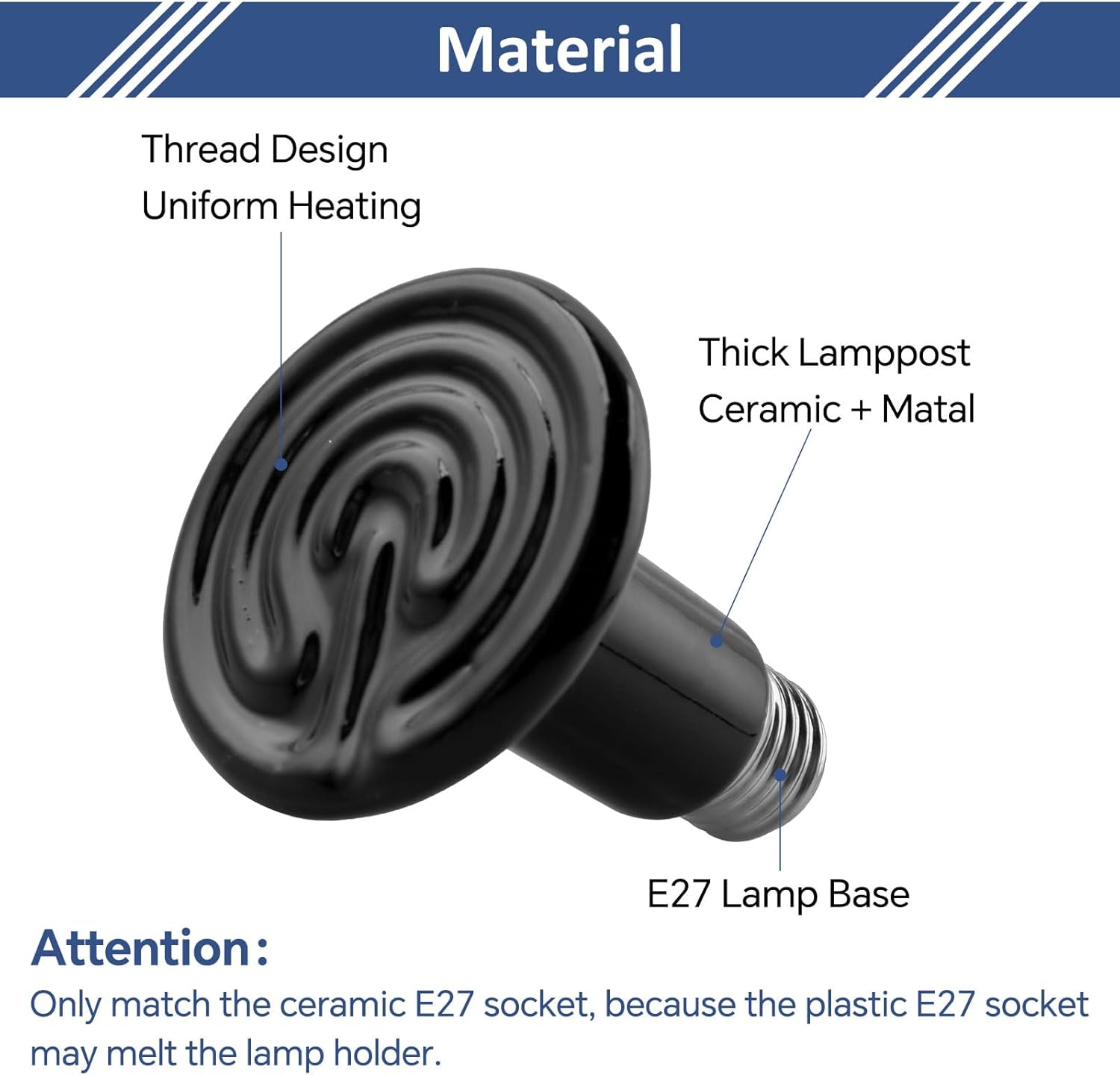 【Heating UP Fast 】The spiral surface design makes the heating area larger and the heat dissipation area wider and more uniform. After turning on the reptile ceramic heat bulb for 10 seconds, you can feel the temperature rise rapidly, and the reptile heat lamp only takes a few minutes to reach the rated temperature.