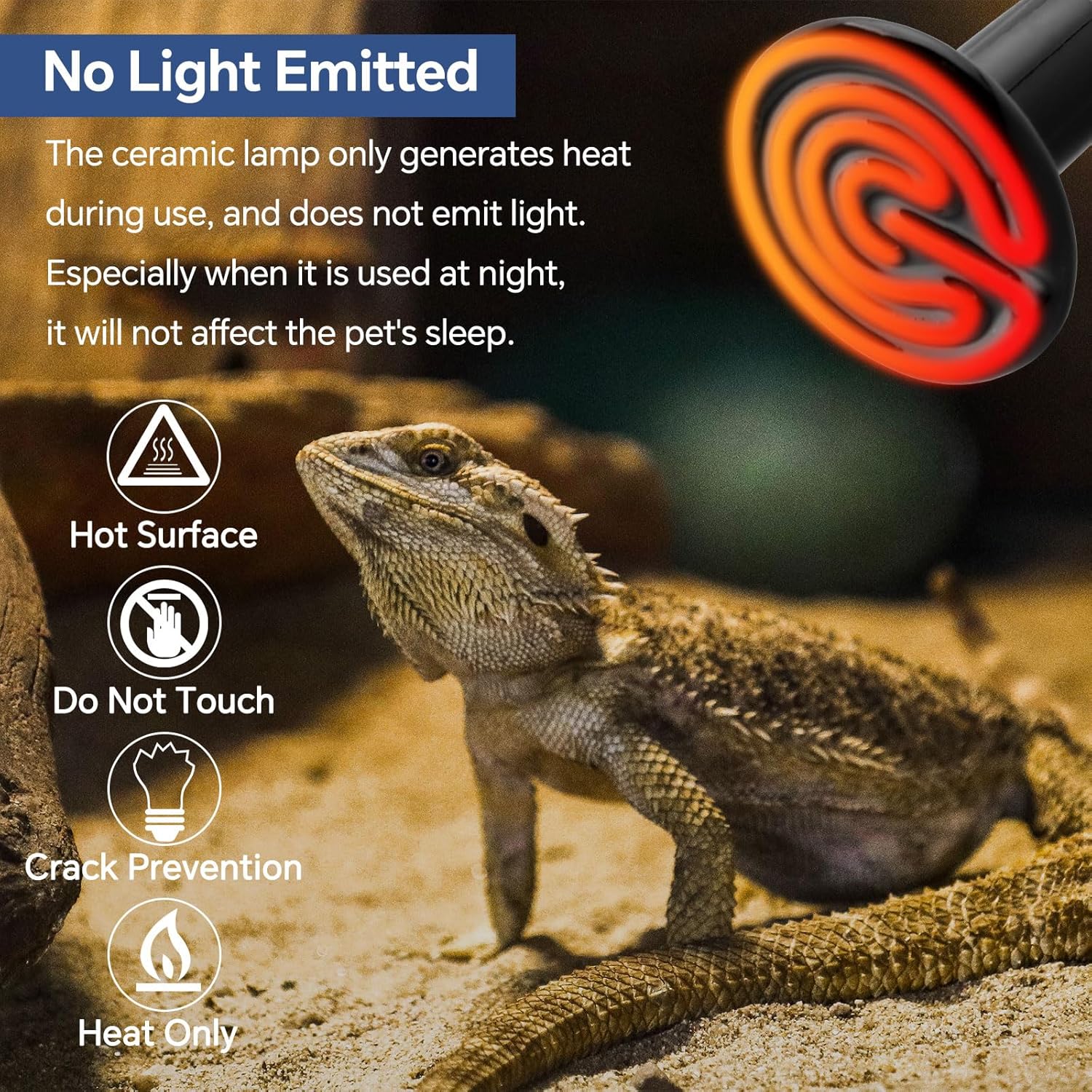 【Infrared Heating】The ceramic heating lamp mainly provides heat by infrared rays to increase the temperature in the breeding box. Infrared heat penetrates the scales and skin tissue, promoting health and healing while dilating blood vessels and improving circulation. Lamp lasts up to 10,000 hours.