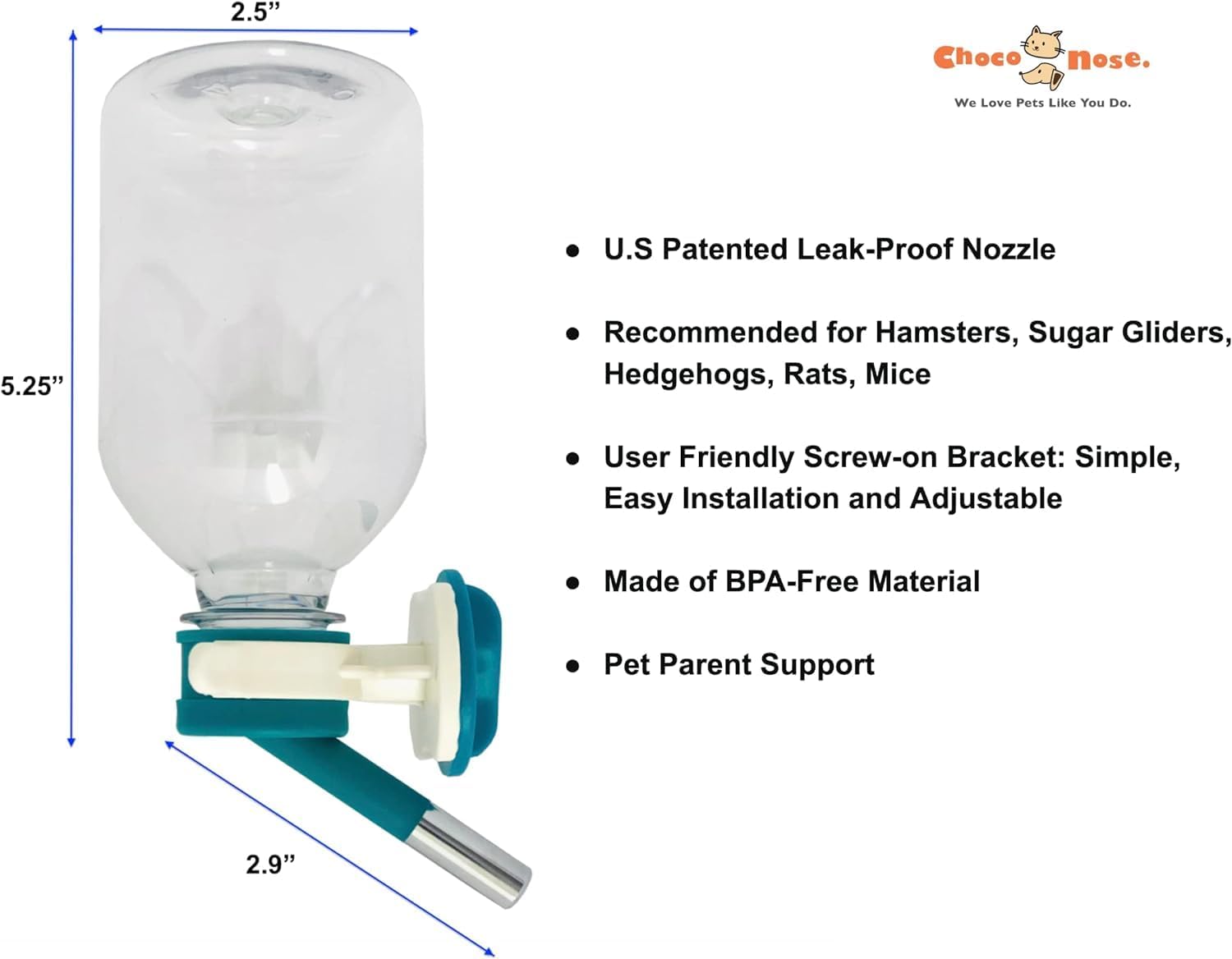 🐾 Why Choco Nose Water Bottle? Are You Tired of Changing the Wet Bedding for Your Pet Cage? This Is The Best Small Pet Water Bottle For Your Beloved Pets. Providing A Wet-Free and Mess-Free Living Area For Your Furry Kids Is Very Essential. Choco Nose U.S. Patented Leak Proof Nozzle Can Prevent Water Leakage Effectively. Our Innovative Design Allows Your Pets to Enjoy Clean and Fresh Water While Keeping Your Home Clean and Dry.