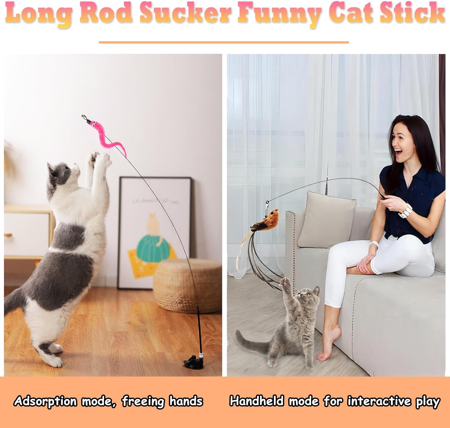 【10 PCS Value Cat Toy Set】The cat stick kit includes 7 toys with bells + 2 cat teasing sticks + 1 suction cup (pack of 10). The plush bird toy is equipped with a feather tail, appealing to all your cat’s attention.The strong suction cup can be adsorbed on floors, walls, glass, stainless steel, and marble, and will not be pulled down by the cat’s strength, (Not suitable for rough surfaces such as cement walls). The wand can be rotated 360° without tangling or twisting, which can keep your pet safe.