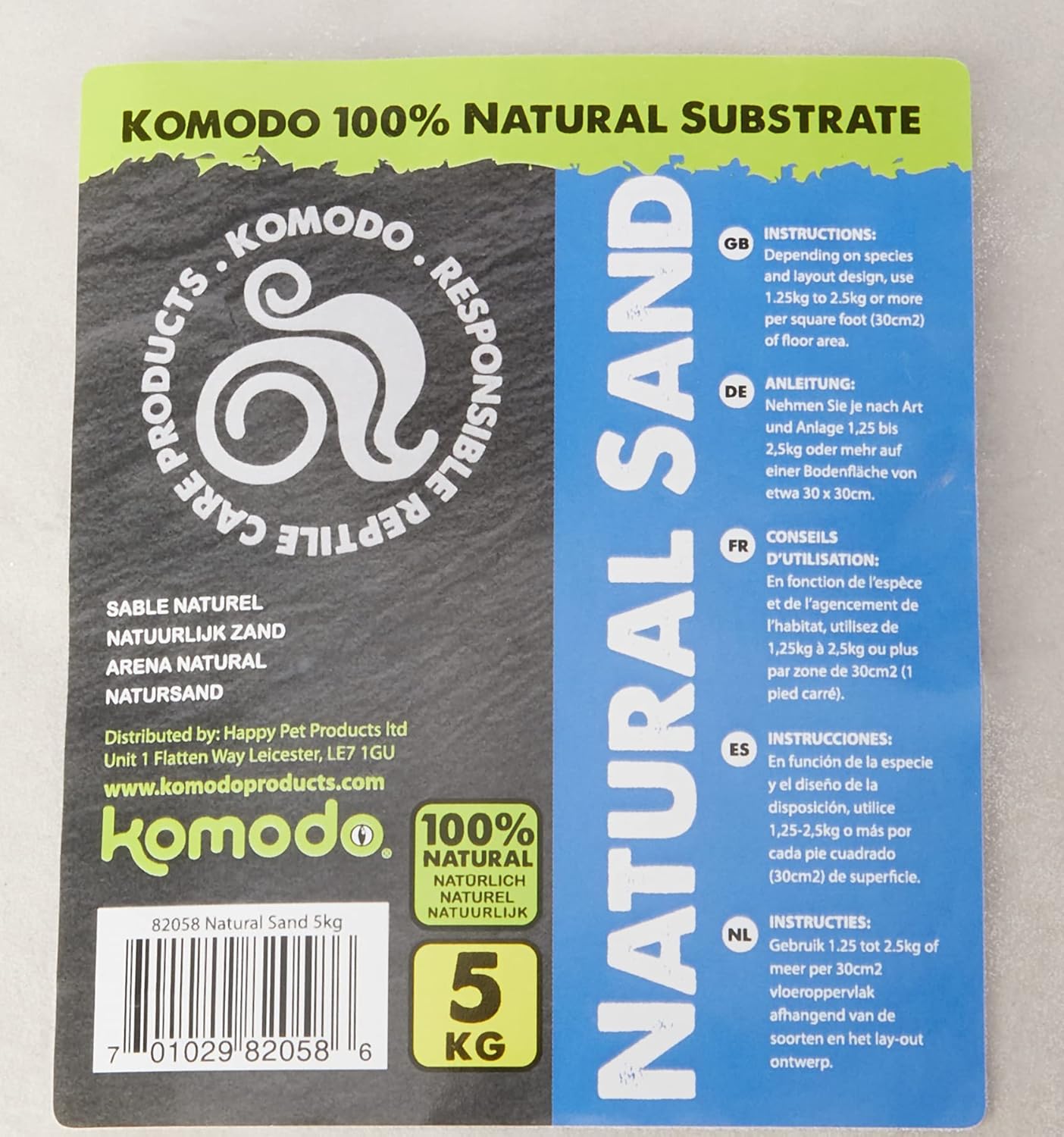 This Komodo Sand is 100% natural and is completely harmless to your reptile if digested. The fine particles is what makes it impossible to it to clog up your reptiles digestive system. This sand has no chemicals or dyes in.Komodo Natural Sand is ideal to create an arid habitat for your desert dwelling reptiles. Due to the sand being natural, it encourages your reptile to dig and burrow and it’s perfect for laying eggs.This sand comes in a 5kg bag only.