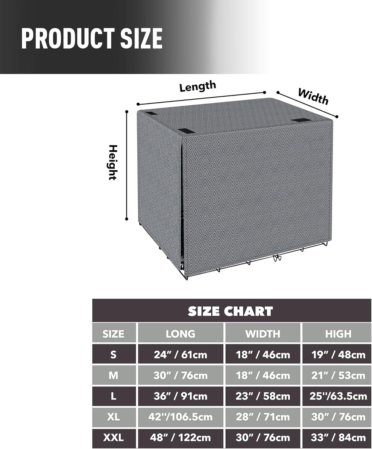 【Crate Cover Size】 24L x18W x 19H inches Universal fits for most brand 24 inch standard wire crate indoor and outdoor. TIP: PLEASE MEASURE YOUR CRATE BEFORE YOU ORDER!