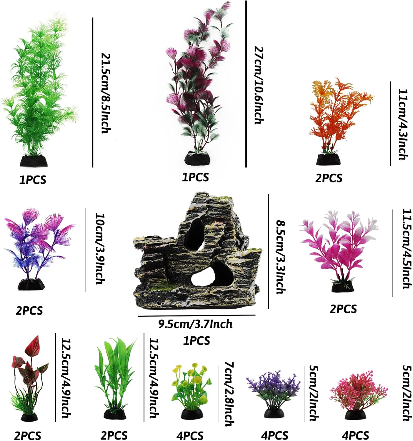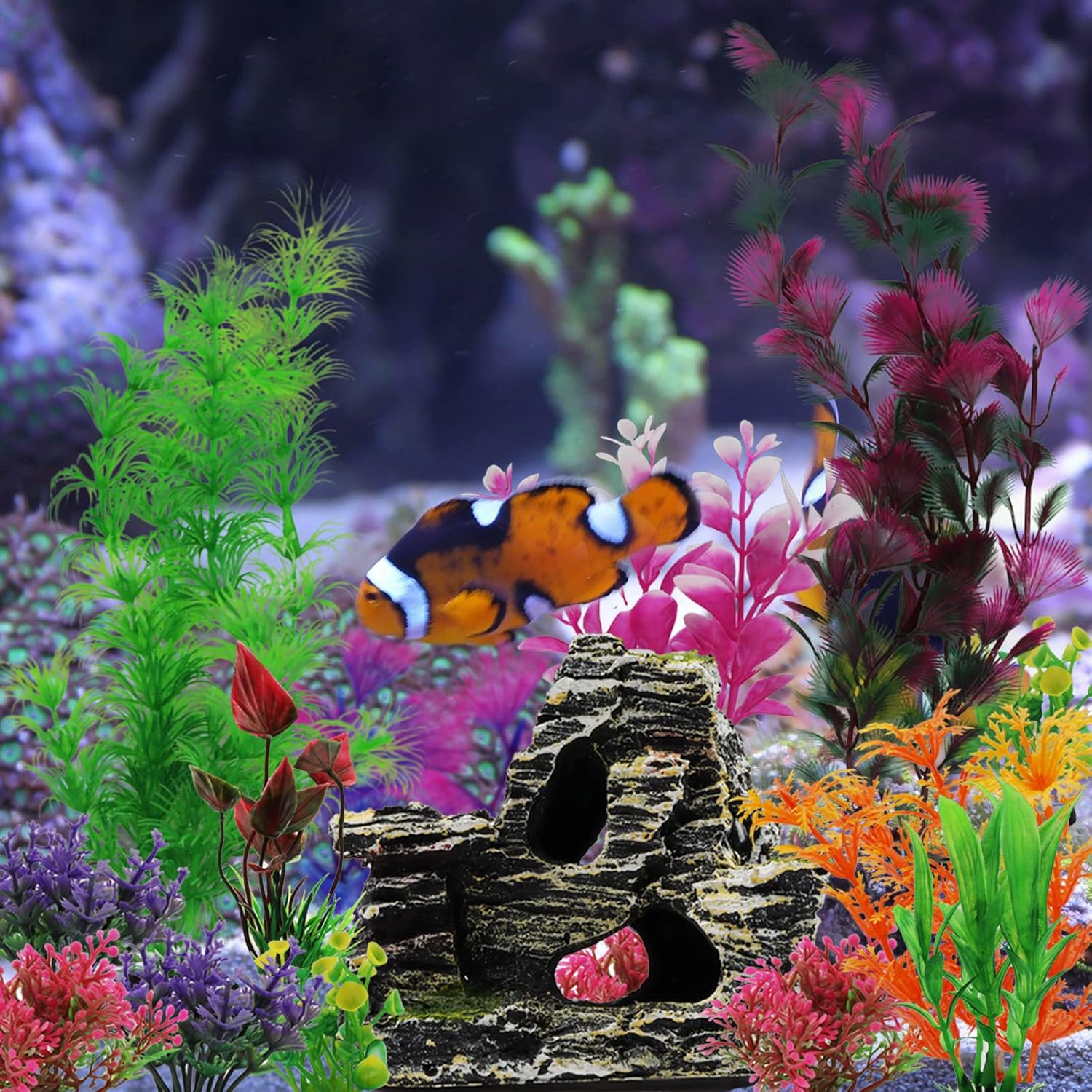 Fish Tank Accessories: 1 pieces Resin rockery aquarium decorations with holes and 24 Pieces aquarium plants: (2 – 4.9 inch and 2 large plant: 8.5inch – 12inch, including green, pink, purple, red and orange)