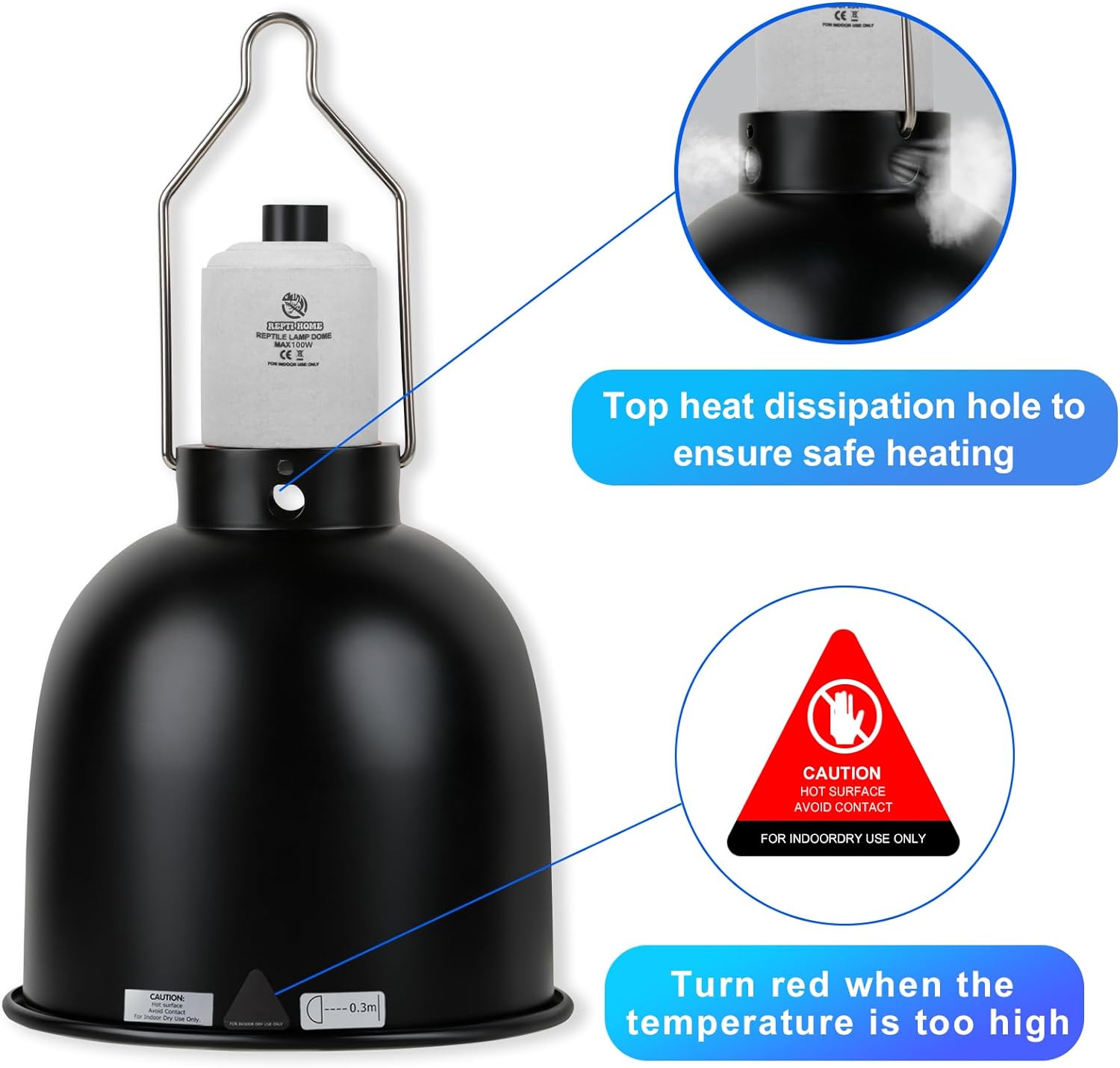 【Good Heat Dissipation】:The top vent of heat lamp kit has good heat dissipation effect, this design prevents excessive heat buildup and reduces the risk of reptile burns while providing your reptile pet with basking spot light.