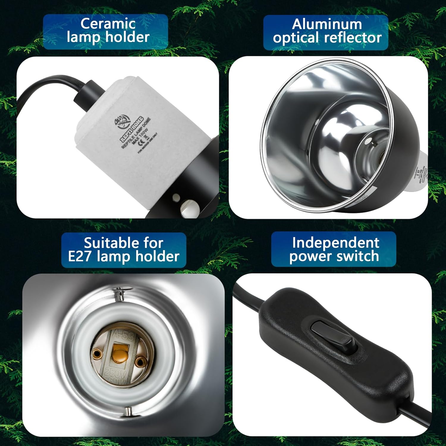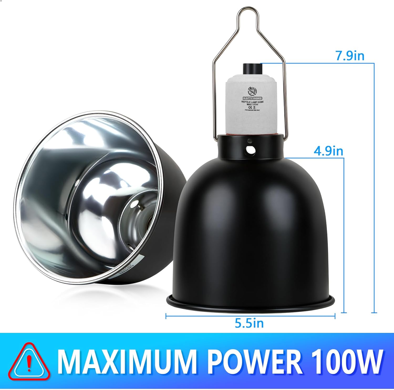 【Aluminum Alloy Reflection】:Our reptile light fixtures are designed with a deep dome aluminum alloy optical reflector, the interior of lampshade is made of metallic aluminum and has been polished, which improves the light reflection efficiency of the bulb and significantly increases the output of UVA and UVB.