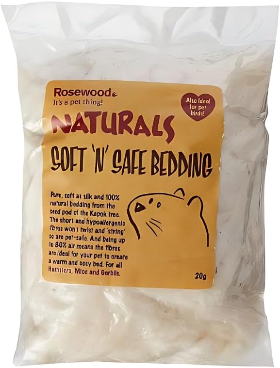 Rosewood Naturals Soft ‘n’ Safe Bedding 100% natural bedding made from the seed coat of the kapok tree, short as soft as silk fibers that cannot be spun or strung. Creates a light, soft and warm nest for all hamsters, mice and gerbils. Buy only the kapok or the kapok pod . Your pet will love the pods, which are soft as silk, removing fluffy fibers from the pods and using them to create a warm and cozy bed. Then your pet will be left with the edible seeds and a pod to gnaw to your heart’s content. The pods are harvested sustainably and ecologically and the bed fiber is ‘light as air’. Each fiber is short, smooth, and breaks easily, so it cannot be spun. This means it isn’t thin like other linens. To use, simply place a bowl in your pet’s house and leave the rest to them. In some cases, it may be necessary to open the tray with your fingers first to allow your pet easier access to the litter and seeds. Also suitable for pet brds. Sustainably harvested, the fiber is hypoallergenic, antibacterial and biodegradable. An ideal alternative to colourful, fluffy bedding