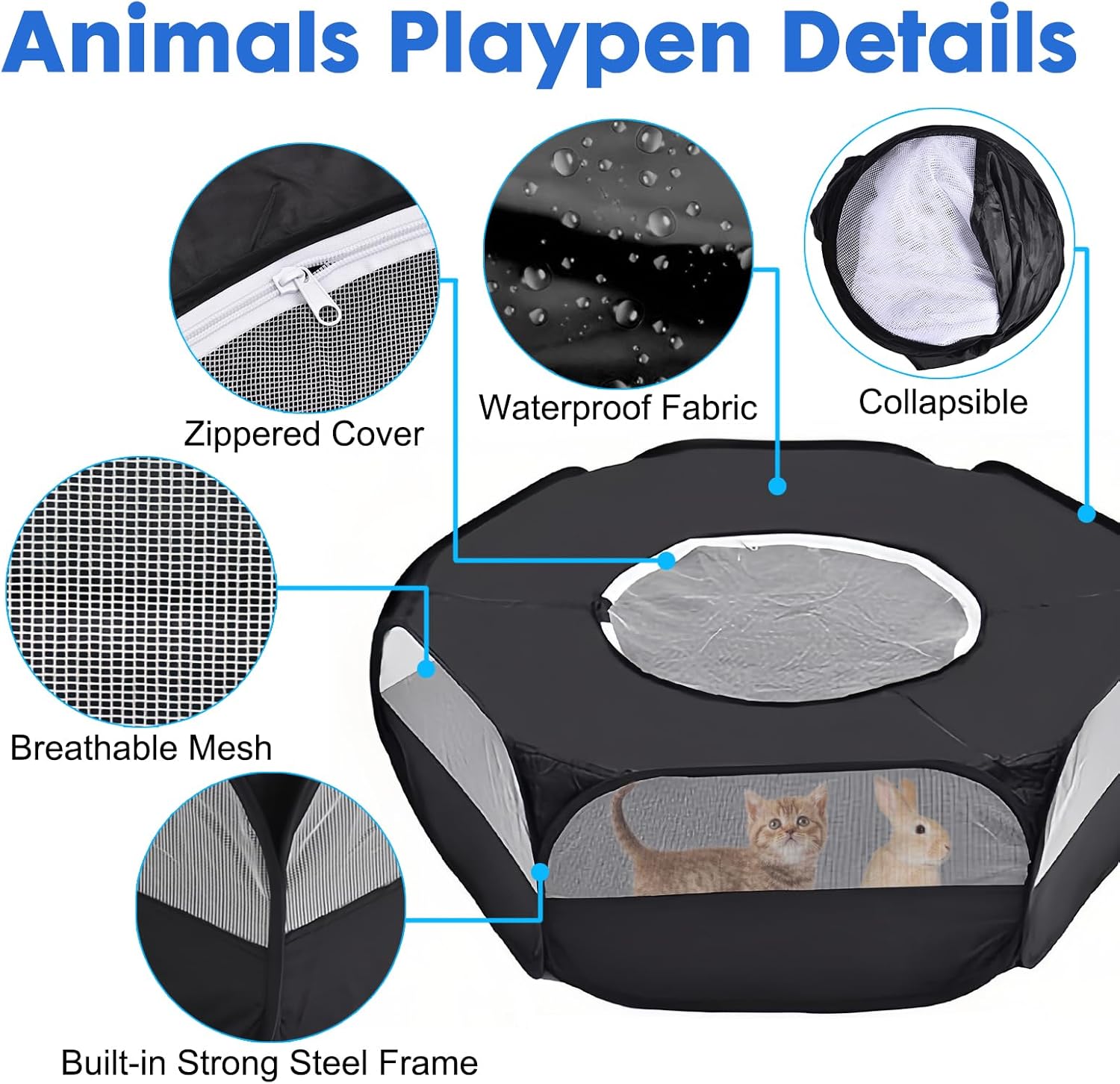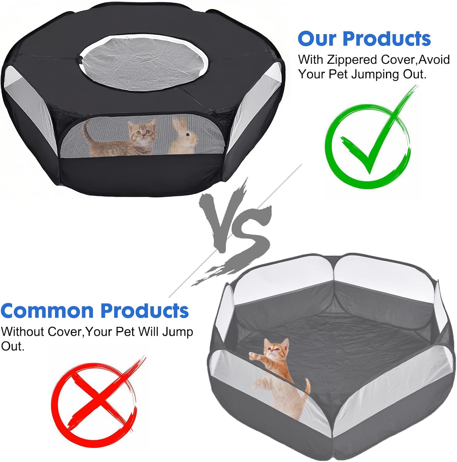 【Top Cover Design】: The new generation of this small pet playpen comes with a top cover, eliminating the need for complex splicing. The cover ensures that small animals cannot run out when zipped, creating an interactive area between owners and pets. Also,this cover is transparent, so it is very covenience for you to see the pets moving freely.