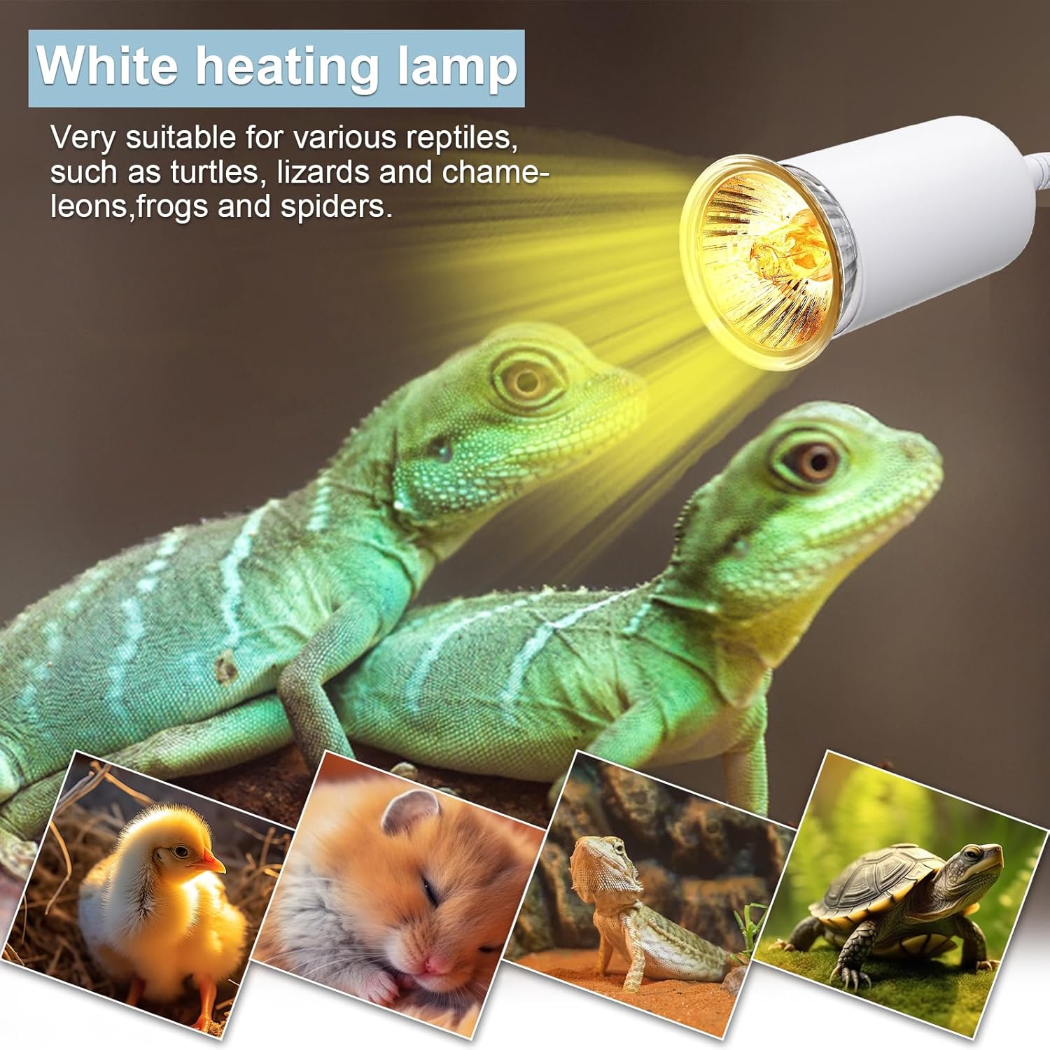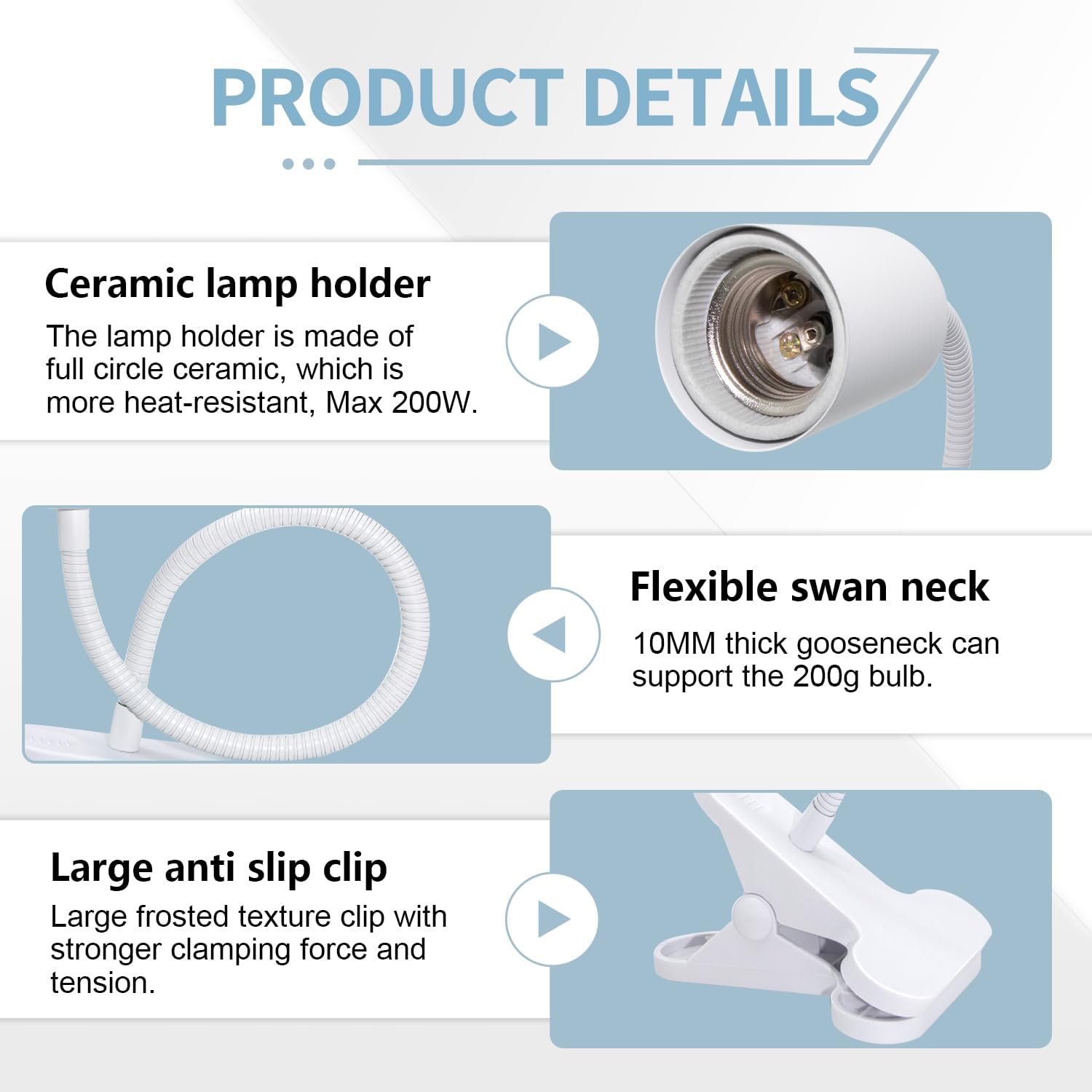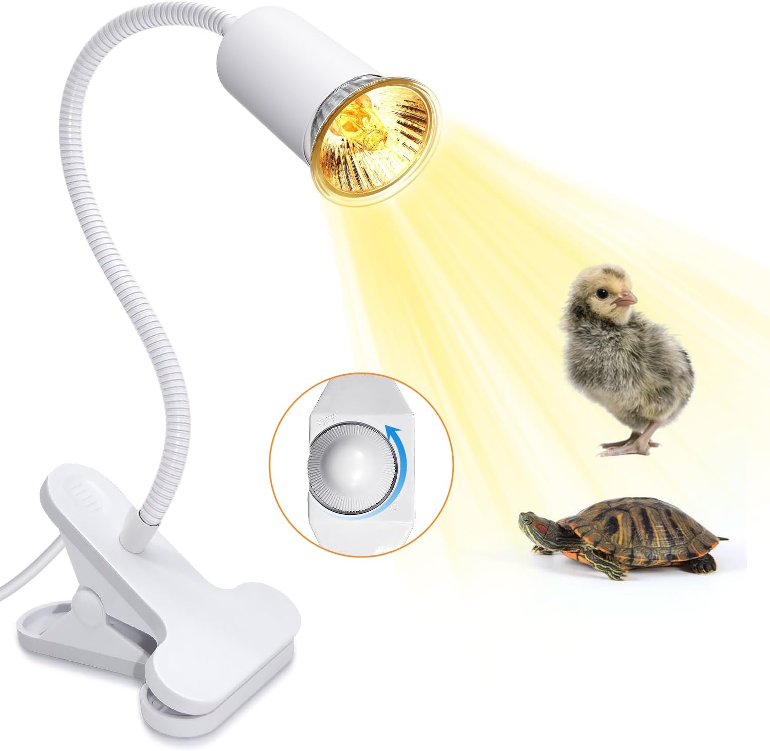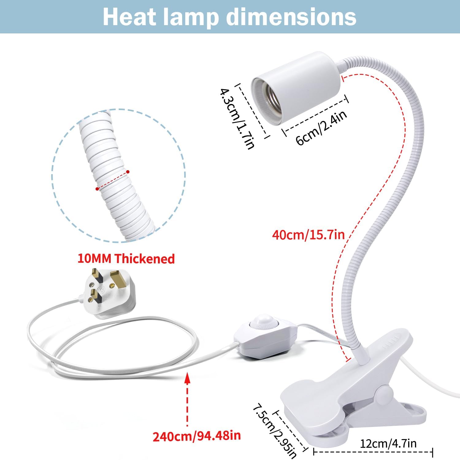 【Stable large clip】Terrarium heat lamp for reptile adopts a large clip, which has stronger clamping force and is equipped with an anti slip pad, which can firmly fix the lamp to an aquarium, turtle tank, or pet nest. Reptile heating lamp has a 40cm long and 10mm thick gooseneck, which provides stronger support and can support a 200g light bulb without collapsing.