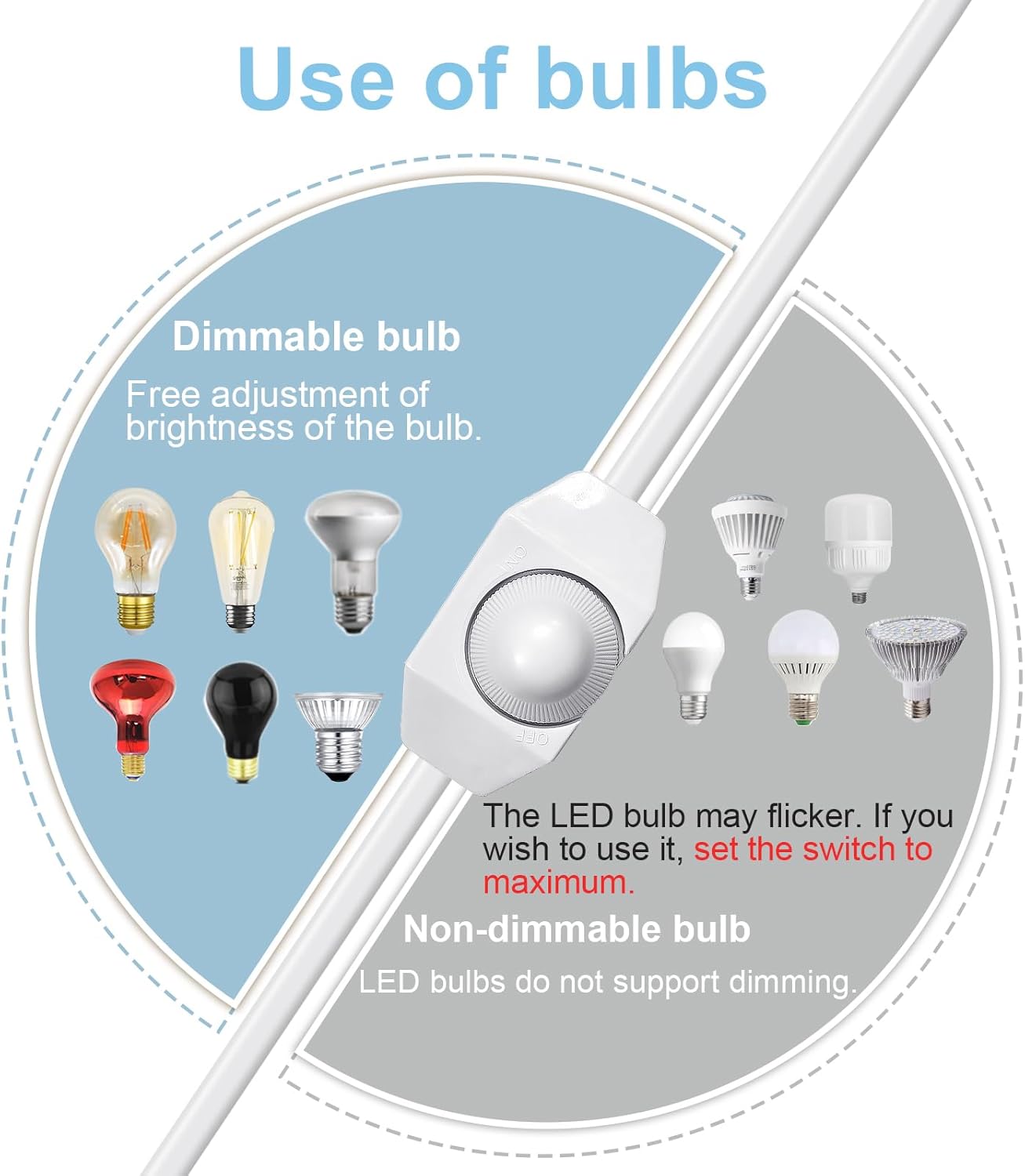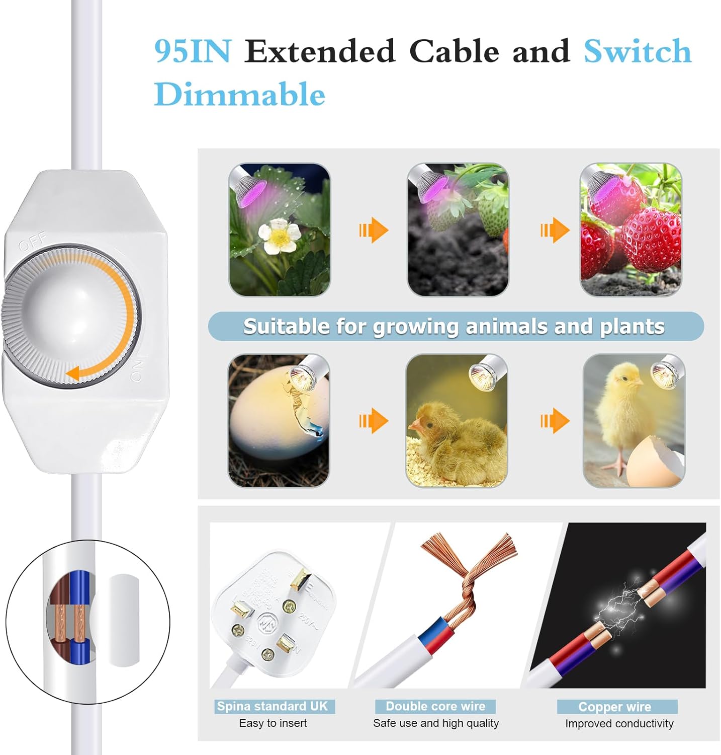 【Convenient design】Aquarium basking light adopts a 240cm long extension cable, which can be moved to different positions according to your needs, making it more convenient to use. Tortoise heat lamp comes with a dimmer switch, and you only need to turn the button to achieve different degrees of brightness adjustment. The gooseneck of the reptile heat spotlight light is flexible and durable, supporting multiple adjustments to the angle of the lamp holder.