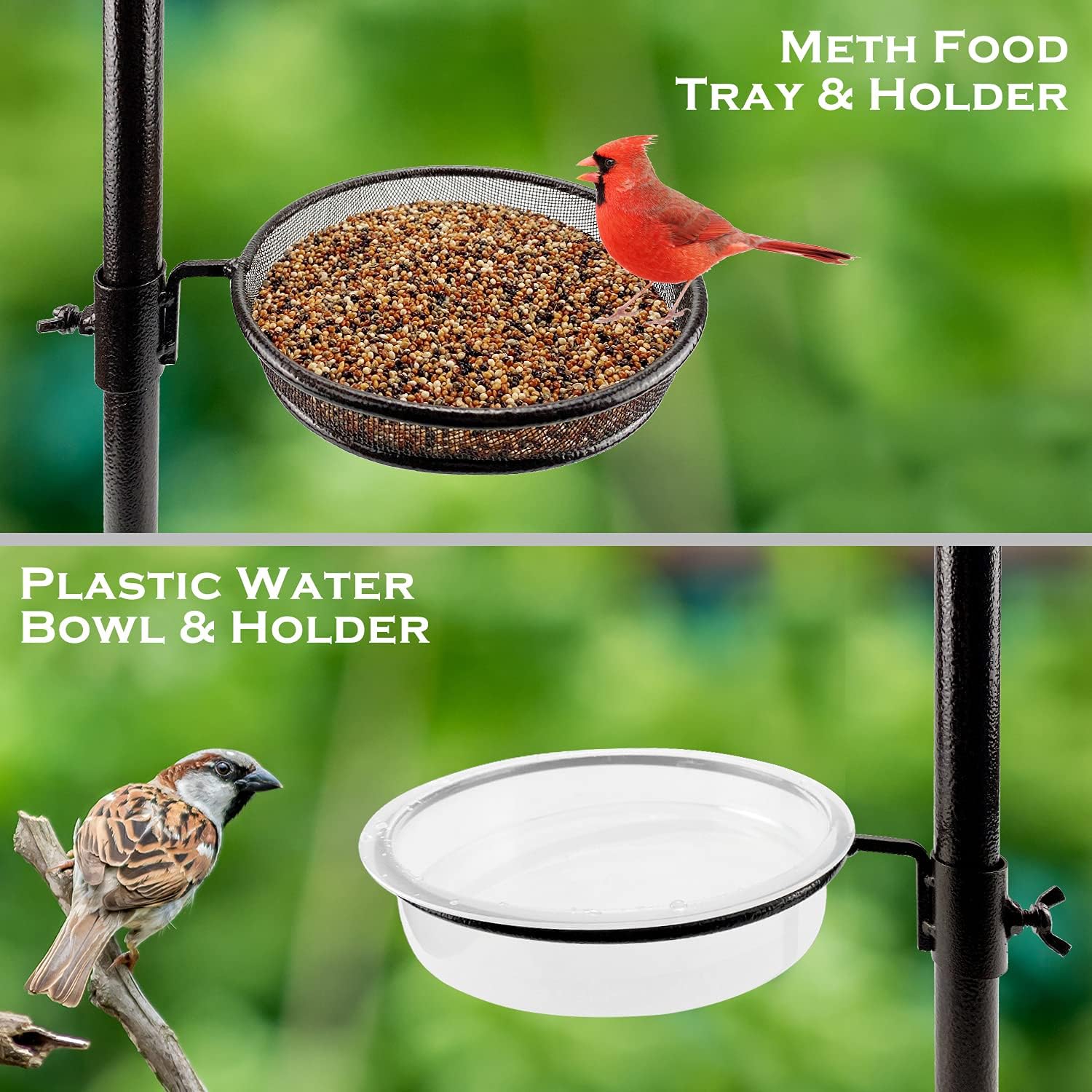BIRD FEEDING STATION KIT: Bird feeders hanging comes with 4 large top-level hooks which are ideal for hanging larger bird seed feeder and is followed by two additional hooks which are completely adjustable anywhere on the bird feeder pole and effective for hanging bird seed catcher and attracting hummingbird, robin, sparrow, woodpecker and starling. Hanging bird bath is great for mealworms, suet, fruit, even seed mixes and bird feeder tray in the box is ideal for birdbath.