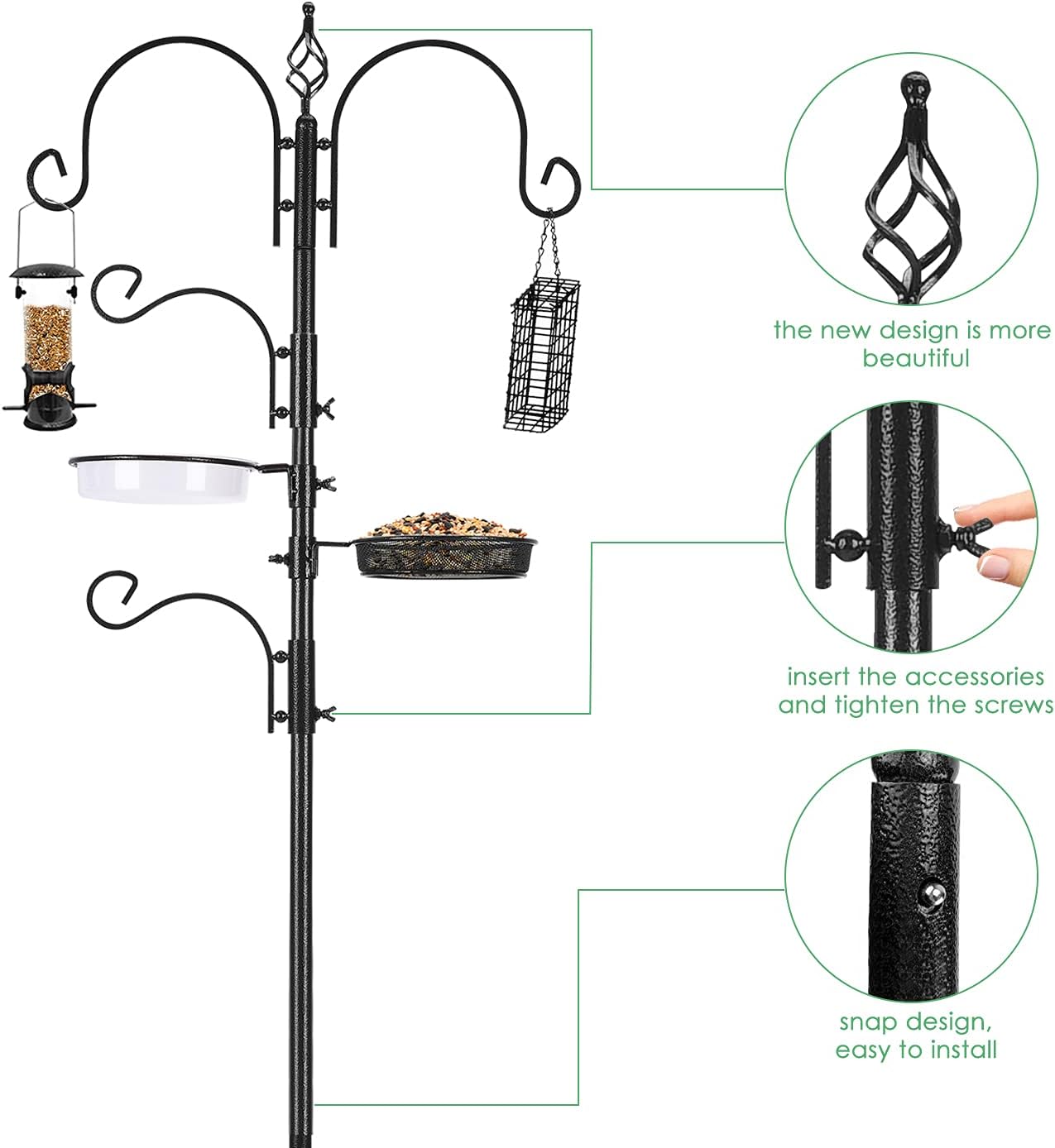 ❤Bird Feeding Station Kit With Hooks & Trays: Bird feeder comes with 2 large top level hooks which are ideal for hanging longer and larger feeders and is followed by two additional hooks which are completely adjustable anywhere on the pole and effective for hanging smaller feeders and attracting hummingbird, robin, sparrow, woodpecker and starling. Wire mesh tray is great for mealworms, nuggets, suet, fruit, even seed mixes and plastic water bowl included in the box is ideal for birdbat