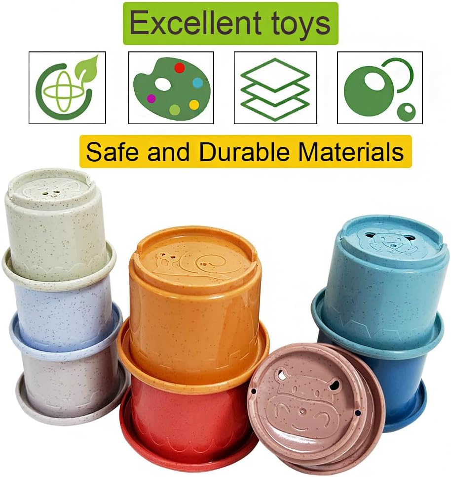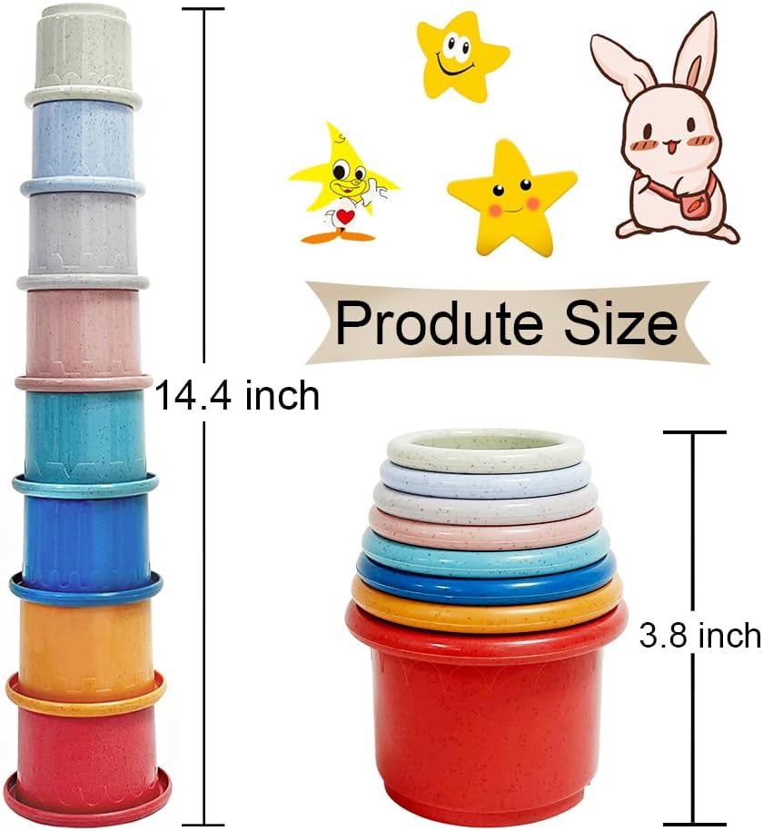 ?[Value for Money] Our rabbit stacking cups set includes 8 different colored stacking cups and comes with some cartoon patterns on the bottom to add fun. The toys from small to large are 2-2.8inch in diameter and 1.57-2inch in height; stacked height is 3.8inch, see attachment for details. Compact size for compact storage